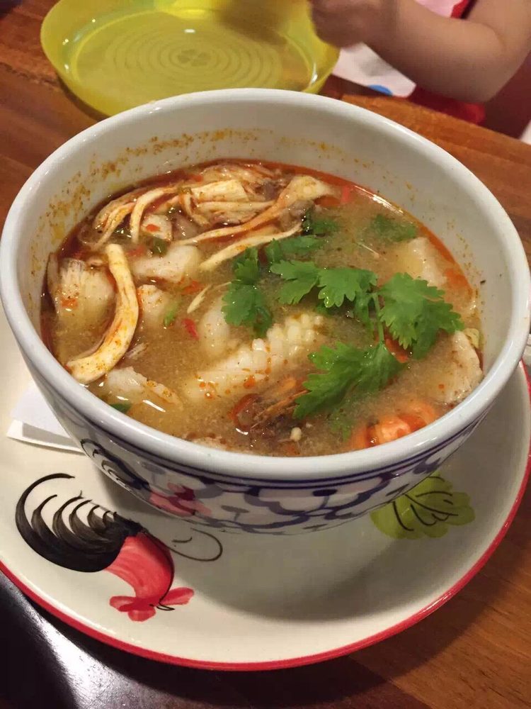 Spicy, sour creamy soup with coconut milk infused with fragrant spices contains milk. Choose Chicken or Seafood tiger prawn, mussel, squid, fish fillet