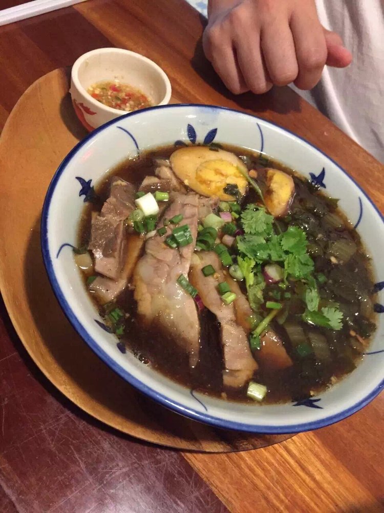 Thaistyle succulent braised pork, egg, salted vegetable in soup served with Thai rice noodle topped with fresh basil